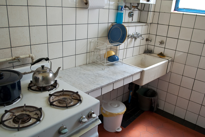 It is fully furnished with a well-equiped kitchen. There is a sizable bedroom closet and kitchen pantry. The bedroom has a double bed with an excellent mattress, and the futon sofa in the living room can fold down for sleeping as well. Other furniture includes a small desk, and a wood table with 4 chairs. Although the terrace is for the entire building, it is rarely used by other neighbors.